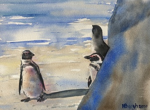 2020Deze aquarel is zeer snel gemaakt. Meestal is dat een teken dat hij geslaagd is. Bij aquarel kan niet goed fouten verbeteren zoals bij olieverf of acryl. Daarom moet je heel veel oefenen en dan opeens gaat het in één keer goed, omdat je het beheerst! Ik heb me heerlijk uitgeleefd met de creditcard techniek in de achtergrond. Die behandel ik ook in mijn aquarelcursus.